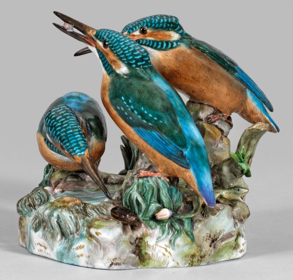 auf naturalistisch gestaltetem Sockel. An einem bewachsenen Gewässer, zwischen plastisch aufgelegten Muscheln, Schnecken und Kleintieren sitzende Gruppe von drei beutesuchenden Eisvögeln mit farbenprächtig staffiertem Gefieder. Ein Vogel mit Fisch im Schnabel. Polychrome Malerei. Sockel mit Goldakzentuierungen. Entw. August Ringler, um 1863. Modell-Nr. F 137. Unw. rest.; Schwertermarke. H. 16,5 cm.
