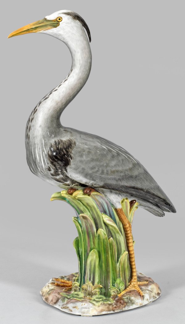 Auf einem mit Seerosenblättern reliefiertem Natursockel, zwischen emporragendem Schilf stehender Fischreiher (bzw. Graureiher) mit langen Stelzenbeinen. Leicht reliefiertes Gefieder mit naturalistisch staffiertem Federkleid sowie Augen- und Kopfpartie. Polychrome Malerei mit Goldakzentuierung. Entw. Ernst August Leuteritz, um 1850. Modell-Nr. Z 57. Haarriss. Rest.; Schwertermarke. H. 55 cm.