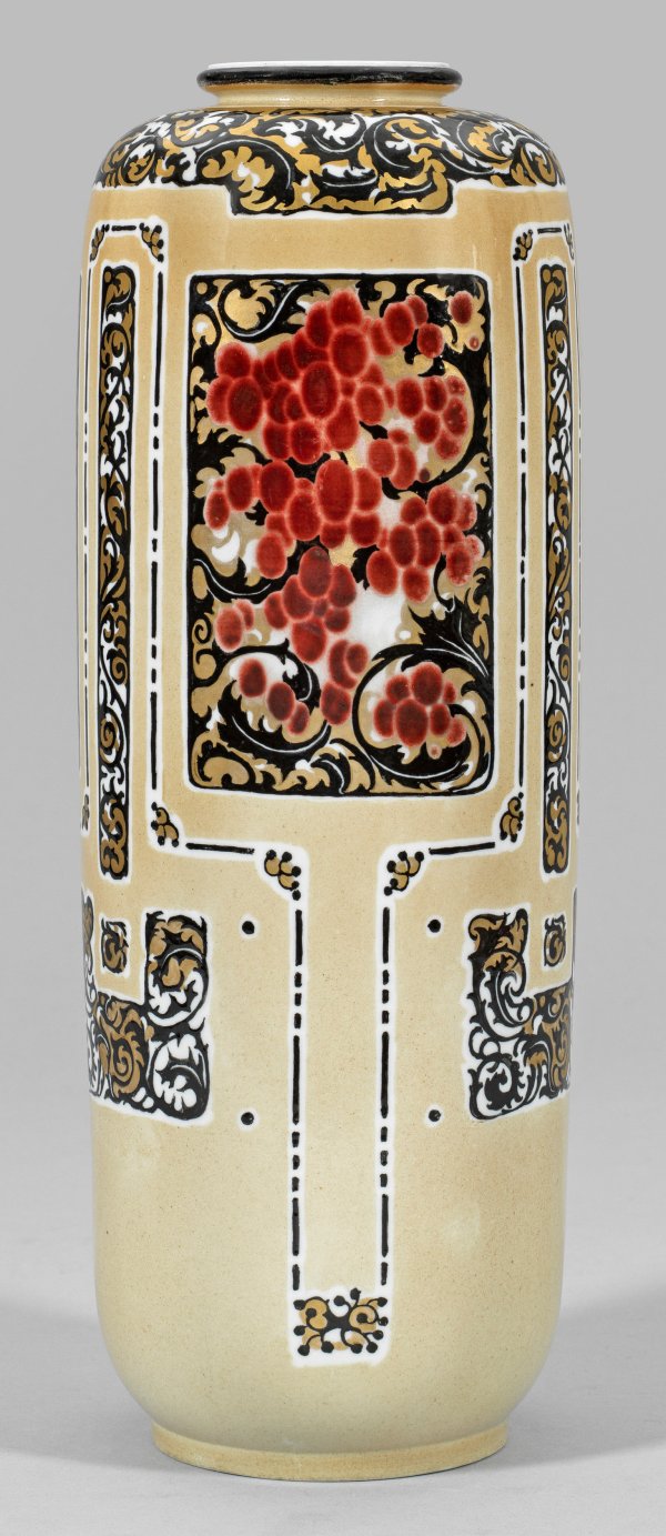 Auf niedrigem Fußring schlanke Zylinderform mit gerundeter Schulter und abgesetztem, profiliertem Mündungsrand. Auf der Wandung, in sandfarbenem Fond ausgesparter Jugendstildekor. Umlaufend große Laubwerk-Reserven mit rotem Beerendekor, umgeben von korrespondierenden Dekorbändern und Bordüren. Scharffeuermalerei in Schwarz und roter Kupferoxidulfarbe mit mattem Gold. Form-Entw. wohl Theodor Grust. Modell-Nr. X 146. Schwertermarke. H. 40 cm.
