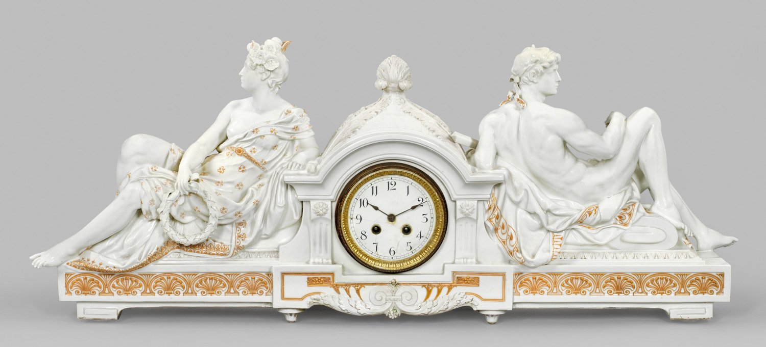 Weißporzellan mit Emailmalerei. Gefußter, verkröpfter Rechtecksockel. Mittig abgesetztes, architektonisch gegliedertes Uhrengehäuse mit kannelierten Lisenen, profiliertem Bogengiebel sowie Haubendach, bekrönt von geschnürtem Akanthusblattknauf. Flankierend, zur Mitte gelehntes, antikisierende Figurenpaar. Junge Dame in langem, tailliertem Gewand mit floralem Kopfschmuck, in der rechten Hand einen Lorbeerkranz haltend, wohl Victoria als Personifikation des Sieges. Gegenüber ein männlicher Akt mit Tuch und Kopfbinde in der Rückansicht, in der Hand ein Schwert haltend, wohl Bellum, den Krieg repräsentierend. Umlaufender Reliefdekor aus Lorbeer- und Akanthusblättern, Rosetten und Blattwellenbändern in Biskuitporzellan sowie feinliniger, stilisierter, ockerfarbener Emaildekor aus Mäander-, Bogen-, Akanthus- und Palmettenfriesen sowie Floralbändern. Messinggerahmtes, verglastes Emailzifferblatt mit arabischen Zahlen. Werkplatine bez. "Lenzkirch A.G.U 1 Million" mit Nr. 581999. Schlagwerk auf Glocke. Modell-Entw. Hans Latt (geb. 1859 in Breslau). Modellbucheintrag Dezember 1899. Dekor-Entw. wohl Max Vopel. Modell-Nr. 6278. Jahresbuchstabe (1902). Zifferblatt rissig. Minim. rest.; Zeptermarke. H. 35 cm. 87 cm x 15 cm.