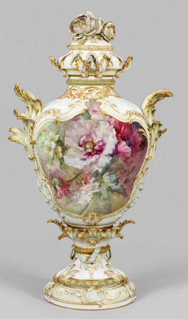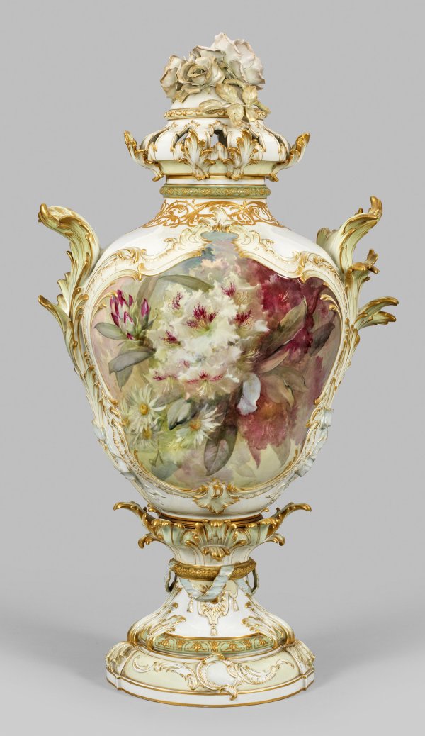 sog. "Schilfvase No. 5". Über gestuftem Rundfuß mit plastischem Blattwerk und Wickelband balusterförmiger Vasenkorpus mit eingezogenem, kurzen Hals und profiliertem Rand, umzogen von reichem Roacilledekor. Aufgewölbter, durchbrochen gearbeiteter Haubendeckel, bekrönt von großem, feinplastisch gearbeitetem Pfingstrosenbukett. Seitlich aufsteigende Schilfbüschel als Handhaben. Beidseitig der Wandung reliefierte Rocaillekartuschen mit farbenprächtigem Blumenarrangement aus u.a. Lilien und Margeriten bzw. Anemonen und Nelken in polychromer, pastelltoniger, sog. Weichmalerei von Franz Aulich (seit 1888 in der KPM tätig). Zart pastellige Fondflächen in hellem Gelbton sowie Mint- und Olivgrün. Umlaufende Ornamentbordüren aus feinlinigem Reliefgold. Form-Entw. Alexander Kips. Maler-Sign. "F. Aulich". Minim. rest.; Zepter- und Malereimarke. Vasen-H. 87 cm.