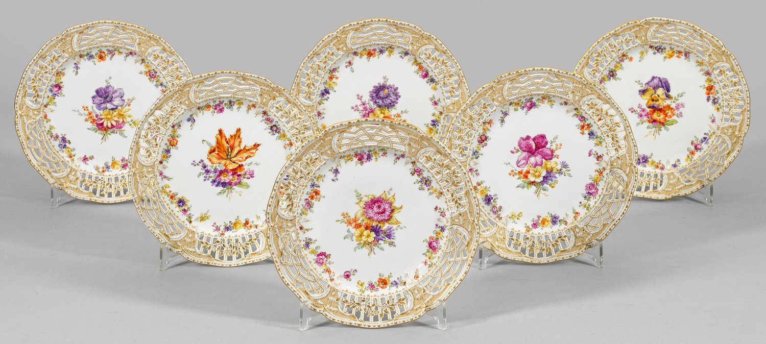 Rund mit geschweiftem Rand. Form "Reliefzierrat". Durchbrochen gearbeitete Fahne mit Rocaillewerk und Schuppenmuster auf chamoisfarbenem Fond. Im leicht vertieften Spiegel farbenprächtige Blumenarrangements, in der ansteigenden Kehle umlaufende Blumengehänge in der Art der Weichmalerei. Reicher Golddekor. Malerzeichen C für Carl Paul oder Emil Richard Claus. Form-Entw. Friedrich Elias Meyer, 1768. Zepter- und Malereimarke. D. 22,5 cm.