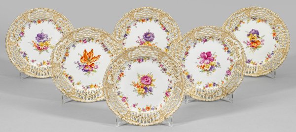 Six gold-decorated porcelain dessert plates with flower decor. Sceptre and painter's mark.