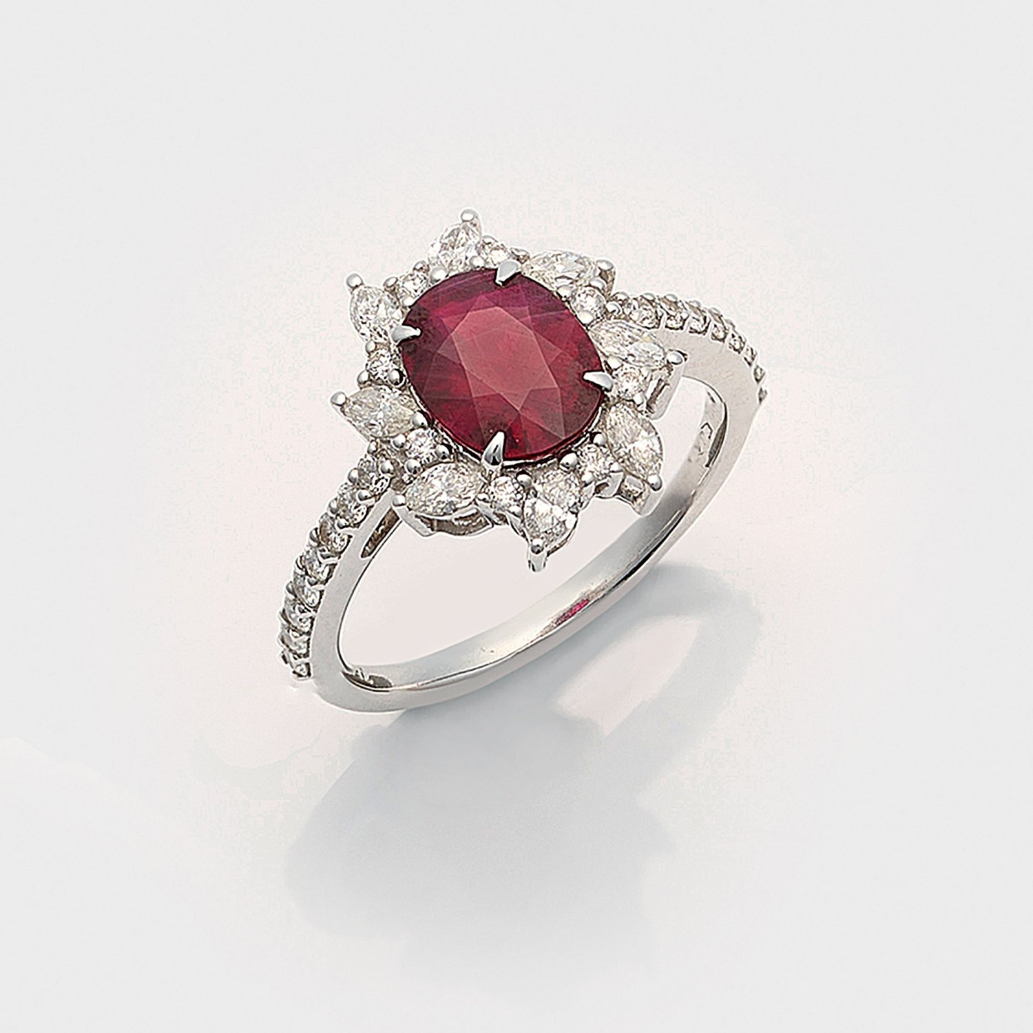 Weißgold, gest. 750. Zentral besetzt mit unbehandeltem Vivid Red-Rubin von ca. 2,22 ct., entouriert von Diamanten von zus. ca. 0,86 ct.; Gew. ca. 3,80 g.
