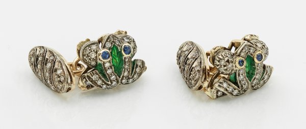 Gelbgold, teilw. mit Silber verbödet und farbig emailliert, gest. 583. Schauknöpfe in Gestalt von Fröschen, ausgefasst mit kleinen Diamanten von ca. 0,80 ct. und 2 Saphiren. Ges.-Gew. ca. 8,11 g.