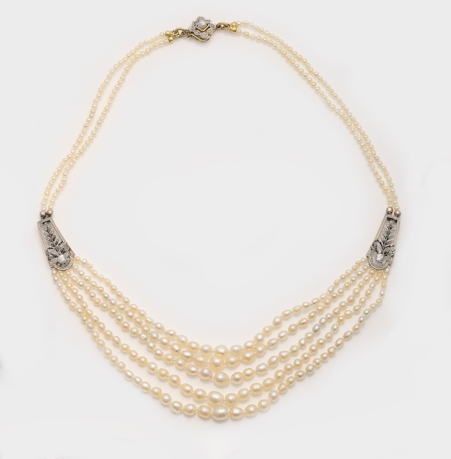 Gelbgold, 14 ct., teilw. mit Platin verbödet. Fünfreihige Mitte in girlandenartiger Anordnung, beidseitig getragen von natürlichen, cremefarbenen Orientperlen in Barockform von ca. 2 mm - 2,2 mm/3 mm - 4,9 mm in sehr feinem, rosé-grün changierendem Lüster, unterteilt durch 2 Elemente in floralem Ajour, besetzt mit kleinen Altschliff- Diamantrosen.