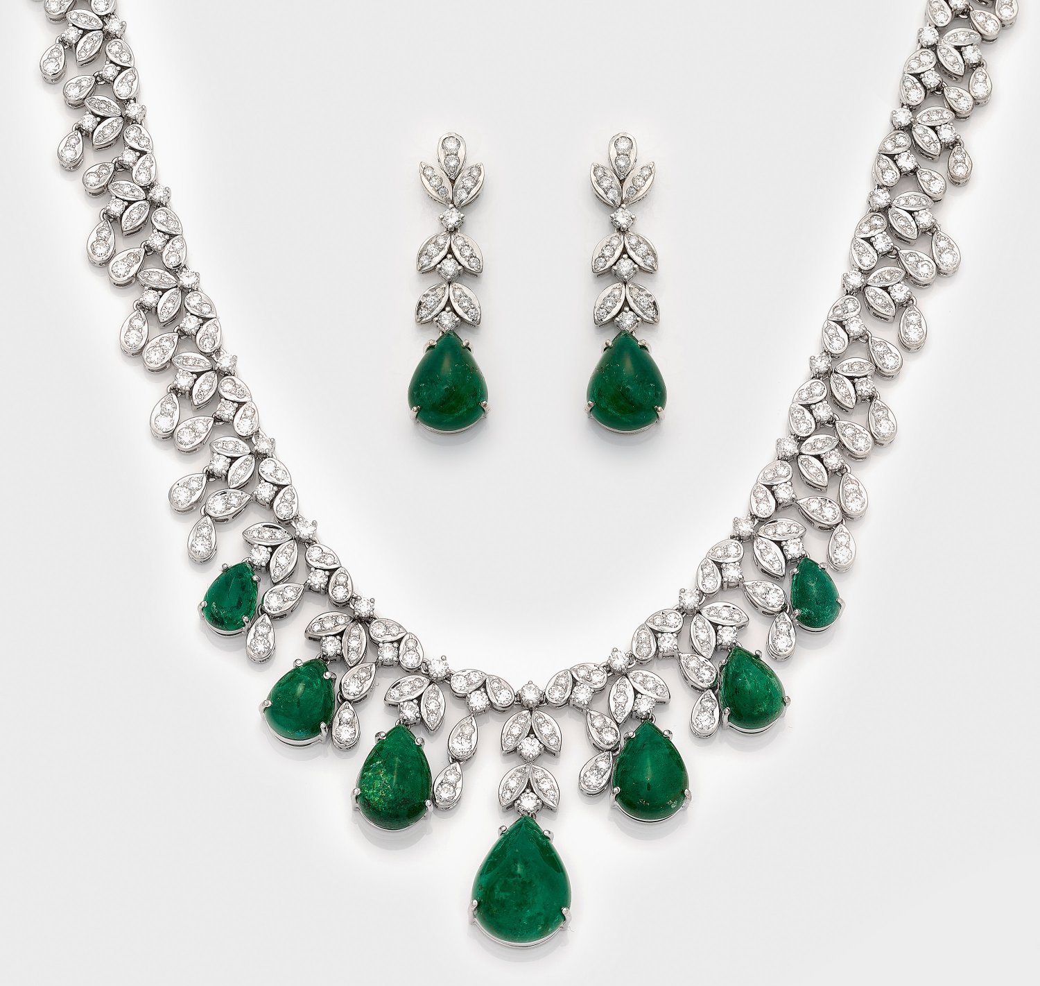Collier und korrespondierendes Paar Ohrgehänge. Weißgold, gest. 750. Schauseitig besetzt mit Brillanten von zus. ca. 14,40 ct. und abschließenden, im Verlauf angeordneten 9 Smaragdtropfen von zus. ca. 45,35 ct.; Ges.-Gew. ca. 97,97 g.