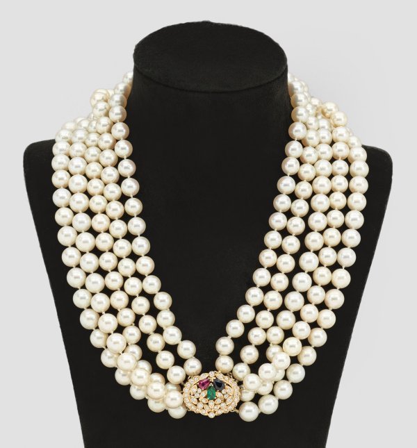Gelbgold, gest. 750. 5-reihiges Collier aus cremefarbenen Zuchtperlen von ca.10 mm in sehr farbintensivem roségrün changierendem Lüster. Floral gestaltete Schließe besetzt mit brasilianischem Smaragd von ca. 0,30 ct., taubenblutrotem Rubin von ca. 0,30 ct., tintenblauem Saphir von ca. 0,30 ct. im Tropfenschliff und Brillanten von zus. ca. 0,80 ct.;