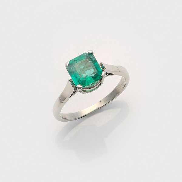 Platin, gest. 960. Zentral besetzt mit leuchtend grünem Smaragd von ca. 2,80 ct. im Emeraldcut. Gew. ca. 5,14 g.