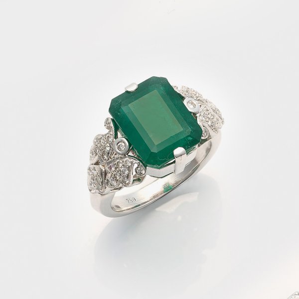Weißgold, gest. 750. Zentral besetzt mit einem Smaragd von ca. 8,30 ct. im Tafelschliff, akzentuiert durch diverse Diamanten von zus. ca. 0,50 ct. (top wesselton/F-G/vsi). Gew. ca. 10,46 g.