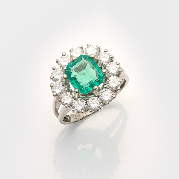 Weißgold, gest. 750. Zentral besetzt mit unbehandeltem leuchtendgrünem Smaragd von ca. 2,15 ct., entouriert von Brillanten von zus. ca. 1,80 ct. (G-H/vvs-vs). Gew. ca. 6,97 g.