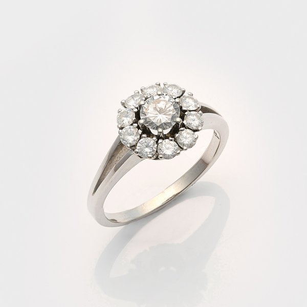 Weißgold, gest. 750. Zentral besetzt mit einem Brillanten von ca. 0,55 ct. (F-G/vvs), entouriert von korrespondierenden Brillanten von zus. ca. 0,60 ct. (F-G/vvs). Gew. ca. 5,97 g.