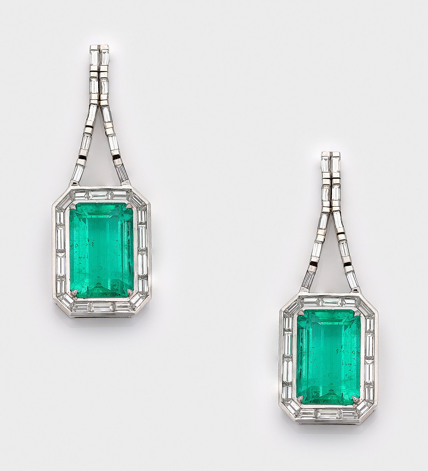 Weißgold, 18 ct.; Zentral besetzt mit 2 leuchtendgrünen, transparenten Smaragden von zus. ca. 16,80 ct. im Tafelschliff, fein umzogen von Diamantbaguetten von zus. ca. 6,00 ct. (F-G/vvs). Ges.-Gew. ca. 15,56 g.