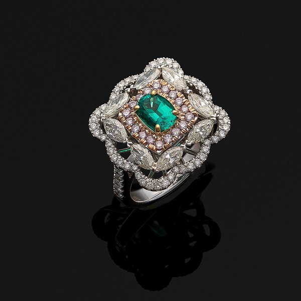 Weißgold, gest. 750. Zentral besetzt mit Vivid Green-Smaragd von ca. 0,51 ct. im Ovalschliff, entouriert von Diamant-Navetten von zus. ca. 1,86 ct. und pinkfarbenen Diamanten von zus. 0,13 ct. sowie weißen Brillanten von zus. ca. 0,48 ct.; Gew. ca. 9,40 g.