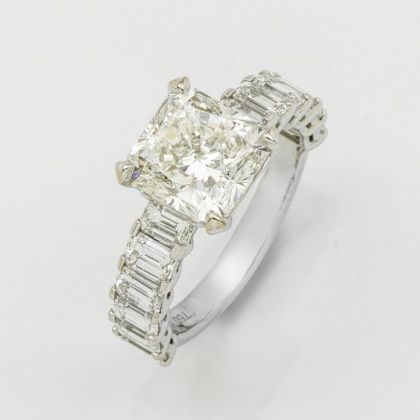 Weißgold, gest. 750. Zentral besetzt mit einem Diamanten im aufwendigen Cushioncut von ca. 4,12 ct. (H/vvs2), flankiert von insges. 14 Diamanten im Emeraldcut von ca. 2,96 ct. (top wesselton(F)/vvs). Gew. ca. 5,36 g.
