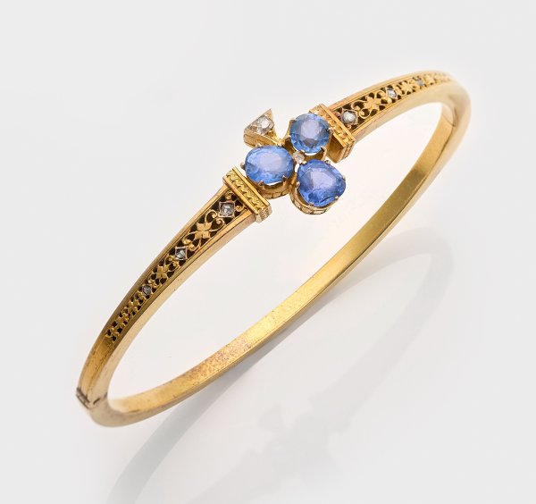 Gelbgold, 14 ct.; Leicht verlaufender Reif, schauseitig ornamental durchbrochen, zentral besetzt mit 3 kornblumenblauen Saphiren von zus. ca. 1,10 ct. und kleinen Diamantrosen. Gew. ca. 13,28 g.