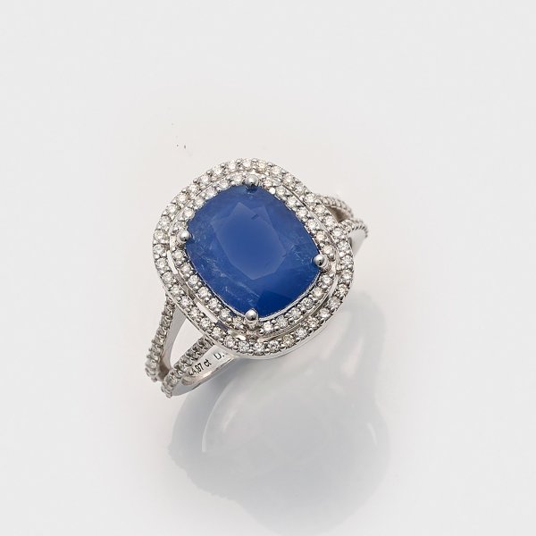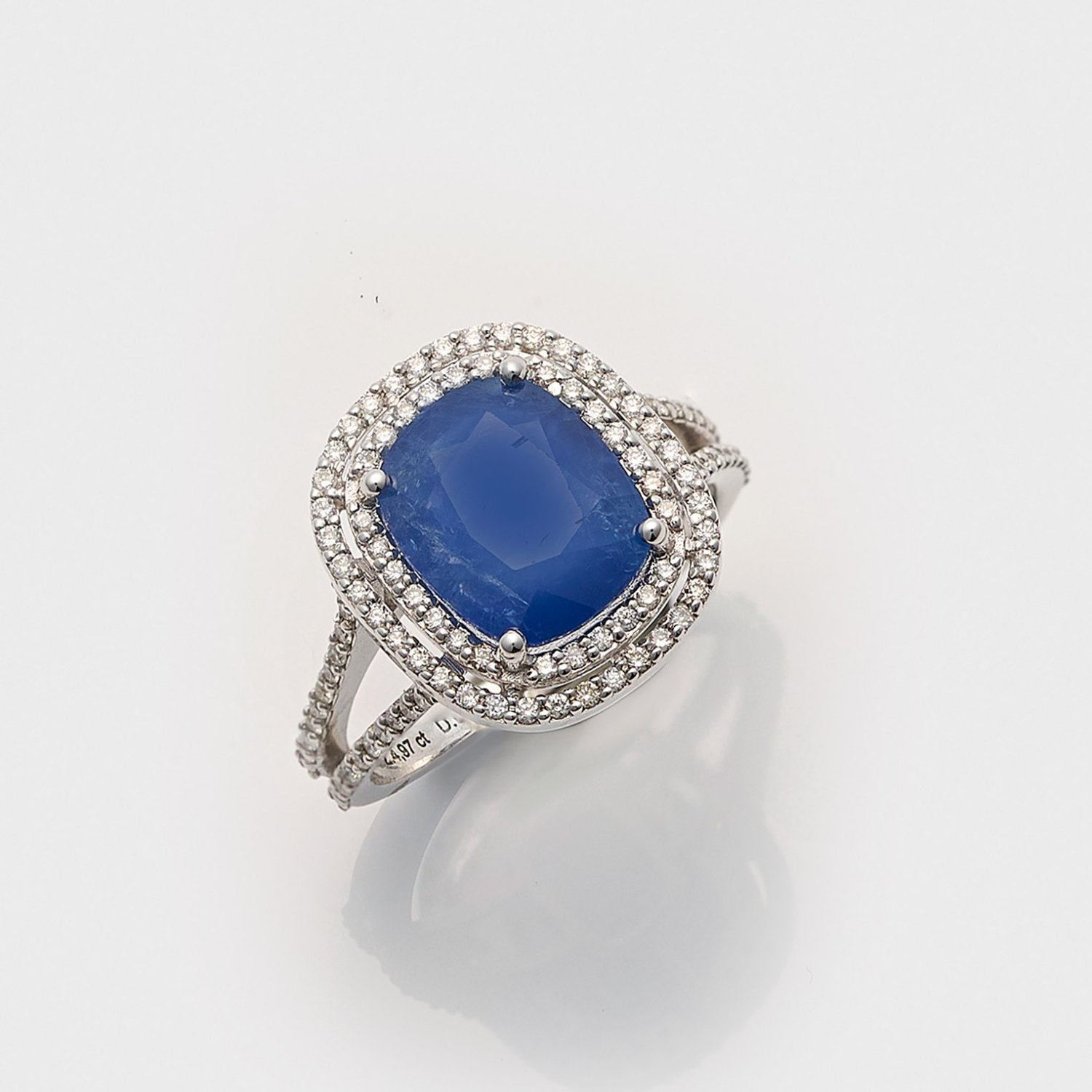 Weißgold, gest. 750. Zentral besetzt mit unbehandeltem, kornblumenblauem Saphir von ca. 4,97 ct., entouriert von Brillanten von zus. ca. 0,41 ct.; Gew. ca. 5,38 g.
