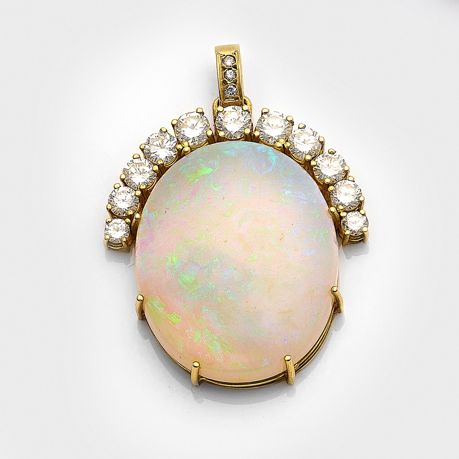 Gelbgold, gest. 750. Schauseitig besetzt mit Weißopal von ca. 30 mm x 22 mm x 7 mm im Cabochonschliff in sehr feinem Farbspiel, bekrönt von Brillanten von zus. ca. 2,00 ct. (G-H/vvs-vs). Gew. ca. 10,07 g.
