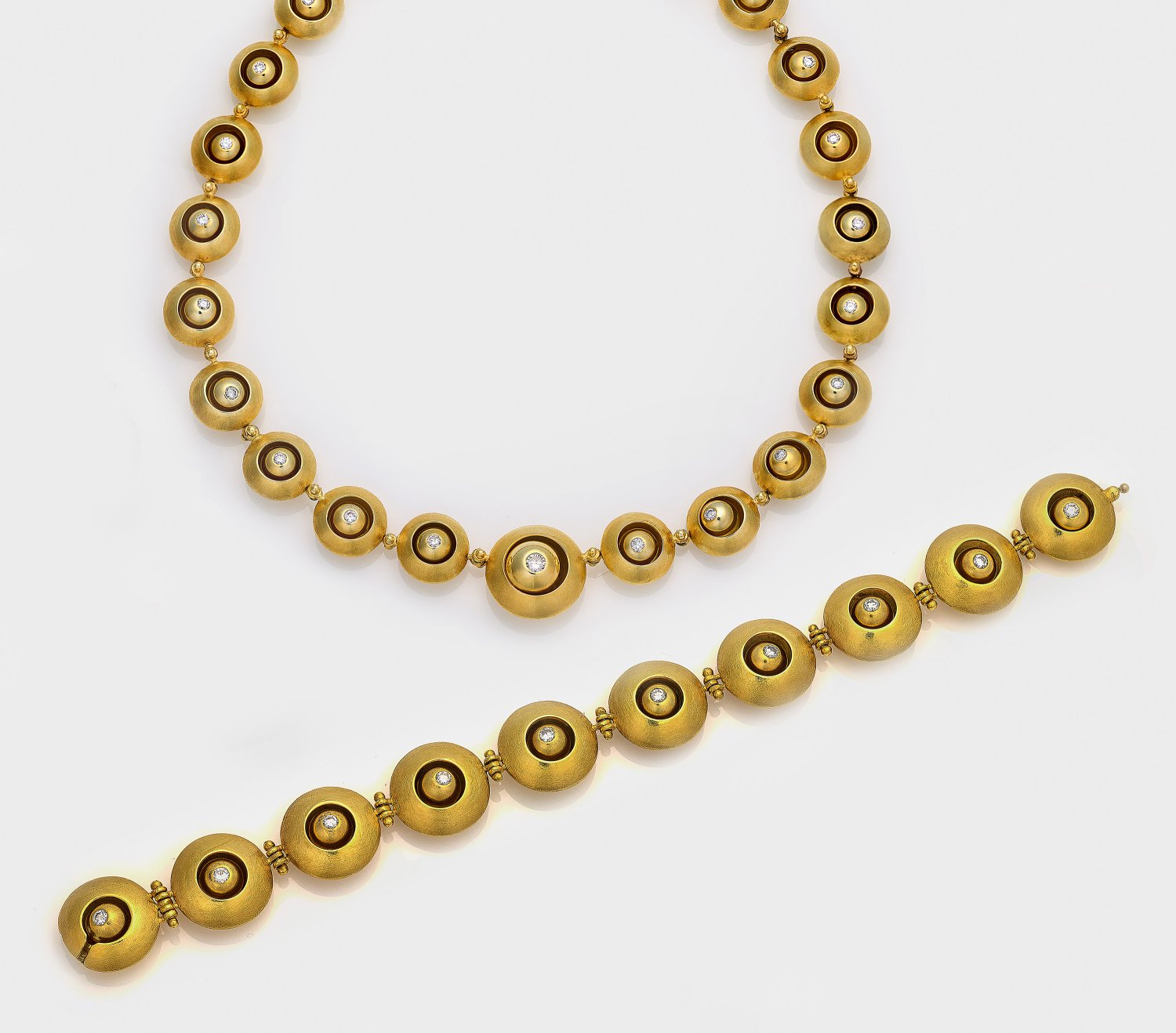 Collier und korrespondierendes Armband. Gelbgold, gest. 750. Einreihiges Collier sowie Armband aus runden, tief gemuldeten, schauseitig geöffneten Gliedern, darin bewegliche Kugeln, bekrönt von Brillanten von zus. ca. 1,91 ct. (F-G/if). Ges.-Gew. ca. 132,29 g. Sehr aufwendige Goldschmiedeausführung des Juweliers Hans-Leo Peters, Ratingen.