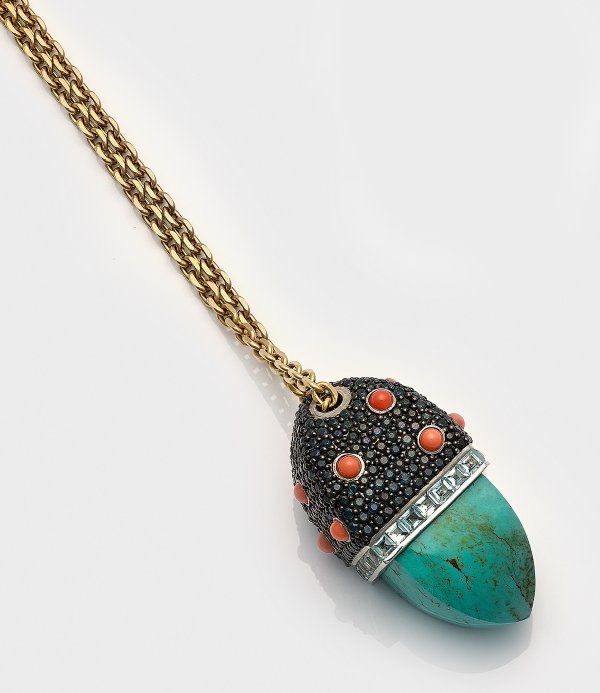 Metall, vergoldet. Anhänger besetzt mit Saphiren von zus. ca. 14,07 ct. in Pavéfassung, Korallencabochons von ca. 3,78 ct. und abschließend ein facettierter Türkis von ca. 116,68 ct., an sog. Ankerkette. Ges.-Gew. ca. 62,61 g.