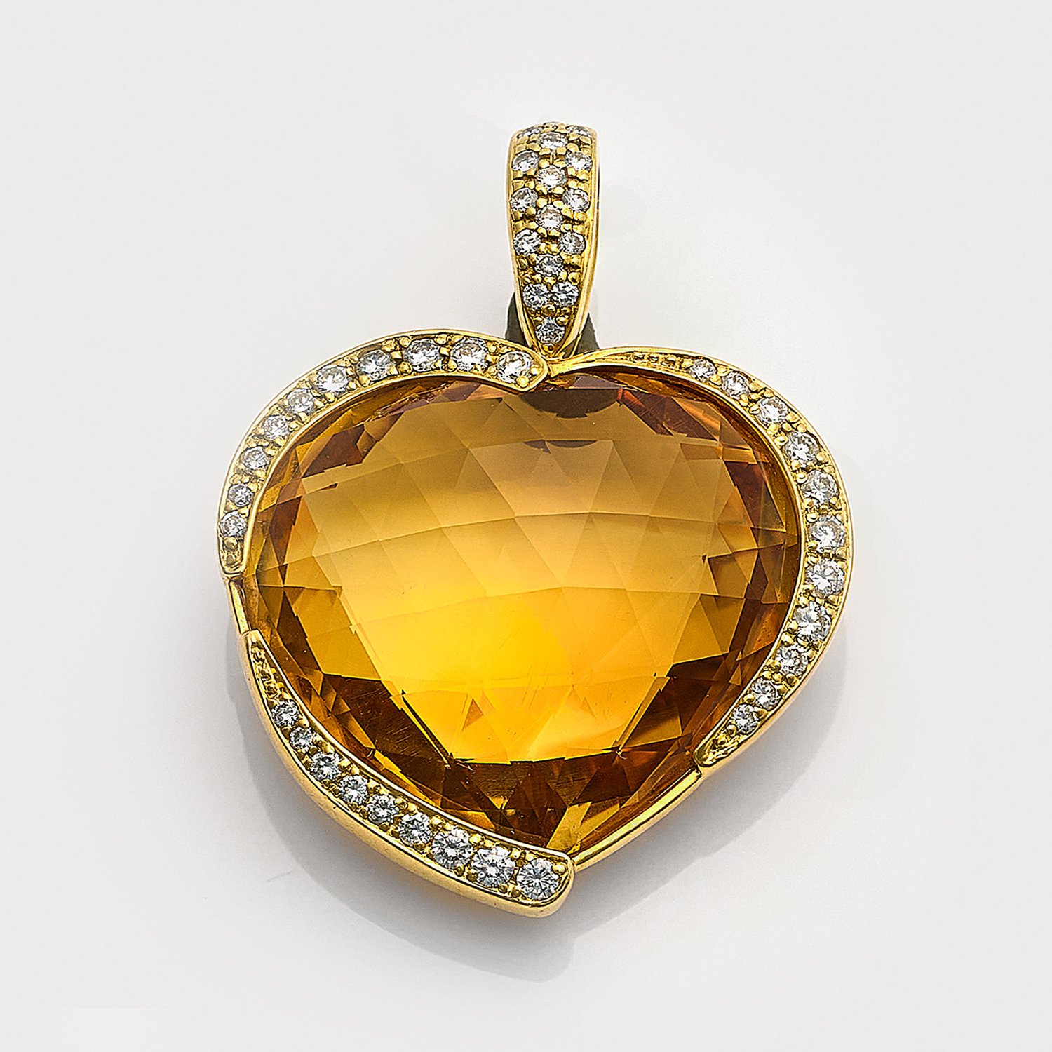 Heart pendant by Patz, set with gold yellow citrine approx. 68 ct. and brilliants approx. 0,80 ct. (F-G/vsi), in 18 k gold. Original box and invoice.