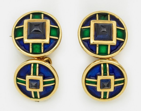 Gelbgold, teilw. farbig emailliert, gest. 750. Die Knöpfe schauseitig mit facettierten Saphiren besetzt. Ges.-Gew. ca. 26,54 g.
