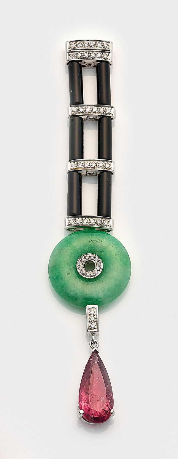 Weißgold, gest. 750. Besetzt mit schwarzem Onyx, mintgrüner Jade, Diamanten von ca. 0,40 ct. und abschließend rosafarbenem Turmalin. Gew. ca. 12,58 g.