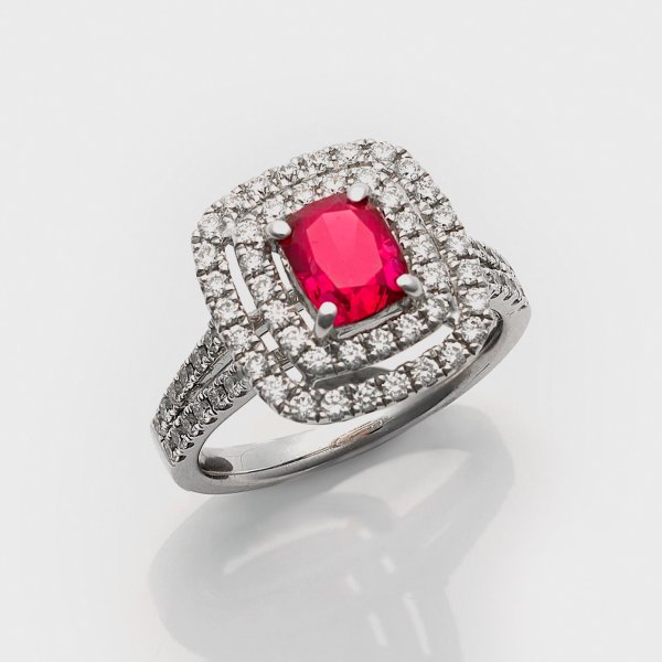 Weißgold, gest. 750. Zentral besetzt mit einem Vivid Pink-Diamanten von ca. 1,05 ct. (vs2), entouriert von Brillanten von zus. ca. 1,20 ct. (F-G/vvs). Gew. ca. 5,24 g.