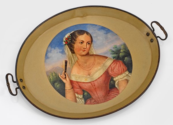 Weißblech, beigefarben lackiert. Ovaler, flacher Spiegel mit ansteigendem Rand. Im Zentrum in einer zarten, runden Goldreserve die Darstellung einer jungen Dame mit rosafarbenem Kleid und Schleier, einen Fächer in der Hand haltend, vor weitem Landschaftshintergrund. Seitliche, gebogte Messinggriffe. Polychrome Lackmalerei mit Gold. Best.; 60 cm x 42 cm.
