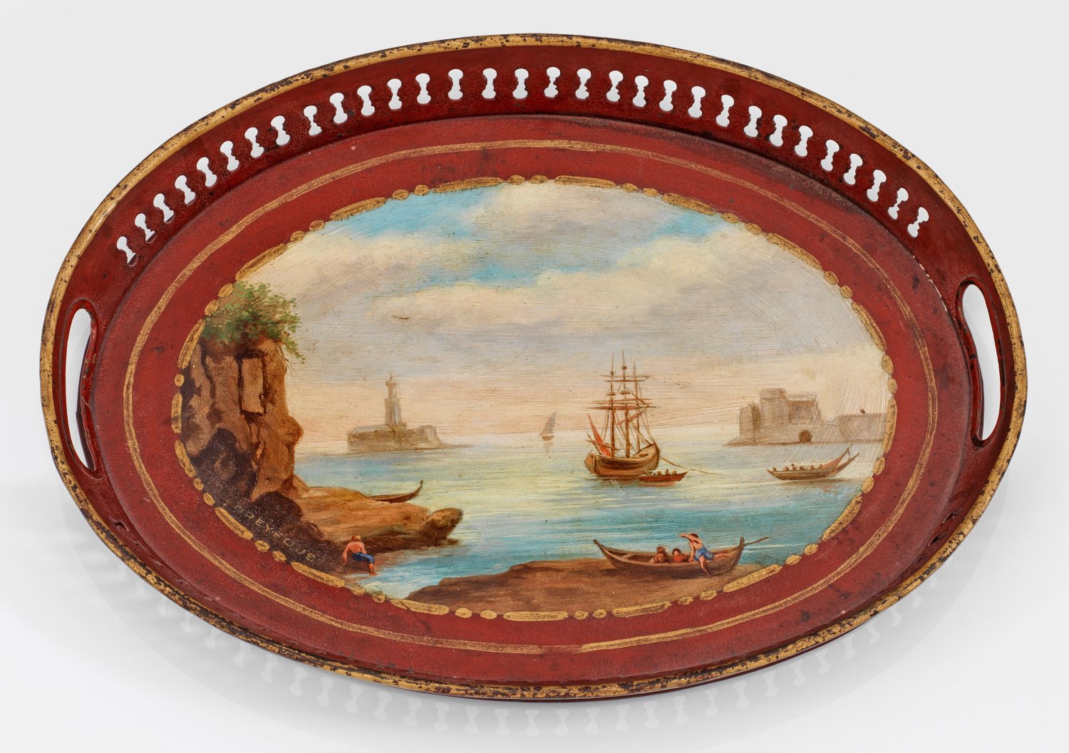 Weißblech, rot lackiert. Ovaler, flacher Spiegel mit aufgestelltem, durchbrochen gearbeitetem Galerierand und seitlichen Aussparungen als Handhaben. Im Spiegel eine ruhige, szenische Küstenlandschaft mit kleinen Fischerbooten und Figurenstaffagen am felsigen Ufer. Am Horizont burgähnliche Festungen sowie Segelboote. Nach Vorbild des Malers Claude-Joseph Vernet (1714-1789). Polychrome Malerei mit Goldrahmung. L. u. sign. "Dreyfous". 30,5 cm x 23 cm.
