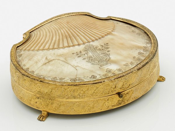 Messing vergoldet, Perlmutter. Über drei Löwenfüßen, ein muschelförmiger Korpus aus feinen, reliefierten Bändern, verziert mit Blatt- und Blütenranken über linear gegliedertem Grund. Der scharnierte Deckel bestehend aus einer eingelassenen Muschel. Am Ansatz mit Gordonen verziert, gerahmt von gravierten Weinranken. Zentrale Darstellung einer von Blättern und Voluten gerahmten Lyra auf einem Sockel. Innen mit beigefarbenem Seidenstoff ausgekleidet. Besch.; H. 5,8 cm. 17,5 cm x 14,5 cm.
