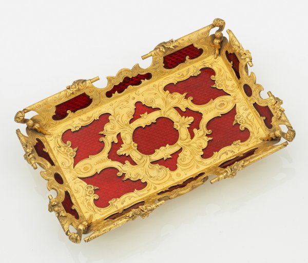 Bronze, vergoldet und teilw. emailliert. Rechteckiges Tablett über vier kurzen Volutenfüßen. Spiegel und ansteigende Fahne üppig verziert mit ziselierten Blatt- und Blütenranken sowie Voluten. Kartuschenförmige Aussparungen hinterlegt mit verglastem, wellenförmig guillochiertem und blutrot emailliertem Grund. Der Rand durchbrochen gearbeitet und dekoriert mit reliefplastisch aufgelegten Blüten. H. 4,5 cm. 21,5 cm x 14 cm.