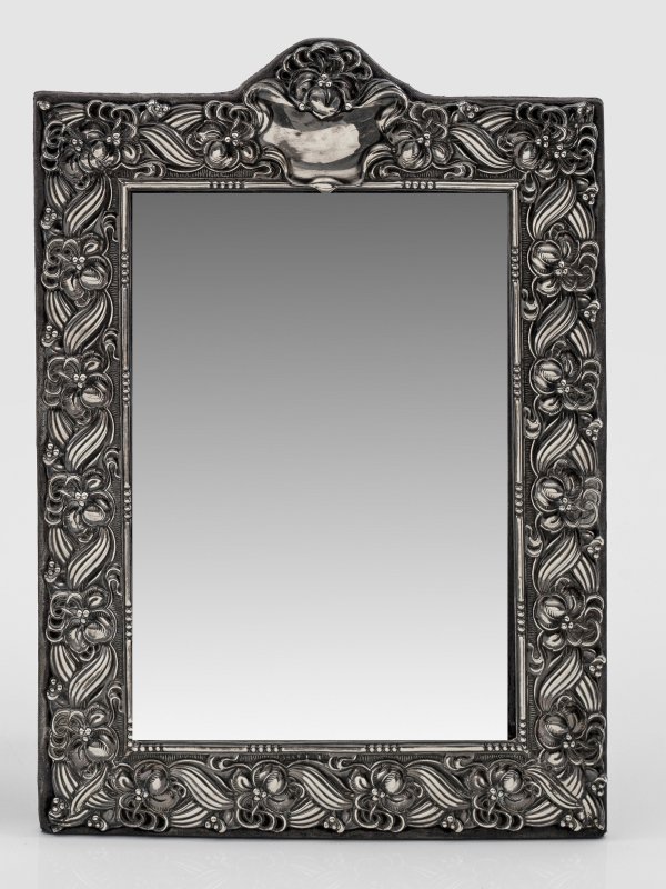 Sterlingsilber. Hochrechteckige, breite Rahmung bekrönt von passig geschweifter, ausgestellter Kartusche. Flächendeckend hochreliefplastisch umzogen von üppigen Blüten und Blättern. Rückseitig aufstellbar, mit lilafarbenem Samt bezogen. Gest., Beschaumarken, Herstellerzeichen, Jahresbuchstabe "g". 29 cm x 20,5 cm.
