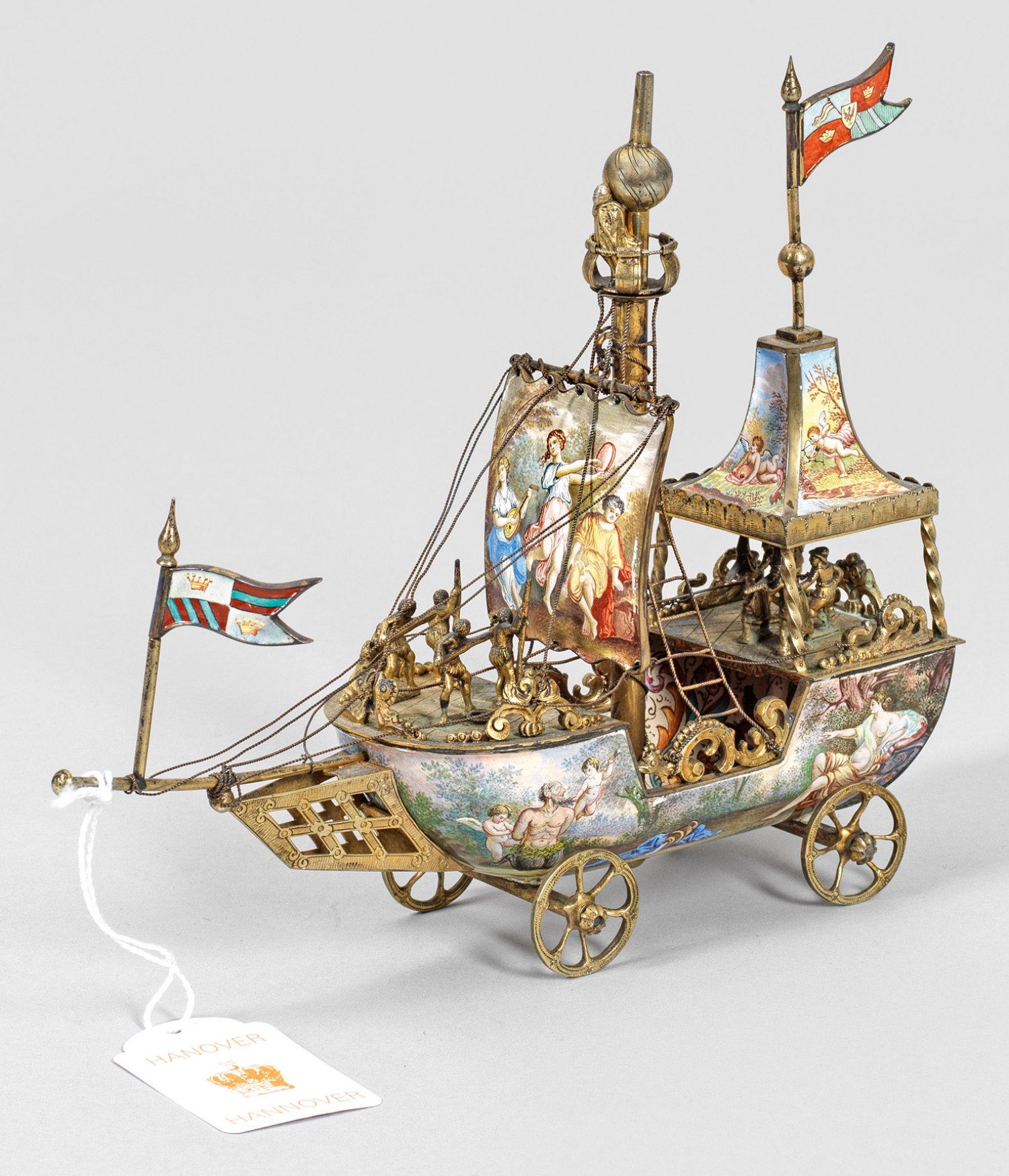 in Form eines einmastigen Segelschiffs auf Rädern, sog. Nef. Silber, vergoldet und teilw. emailliert. Schiffförmig gebogter Korpus mit detailgetreu dargestelltem Mast, Segel, Takelagen und baldachinähnlichem Aufbau. Auf dem Vorder- und Hinterdeck sowie im Mastkorb mehrere bewaffnete Figurendarstellungen. Rumpf, Baldachin, Wimpel und Segel verziert mit fein gemalten, polychrom emaillierten Szenen aus der Mythologie. In Rocaillen durchbrochen gearbeitete Reling. Gest., Beschauzeichen, Meister K. u. k. Hoflieferant Ludwig Politzer (tätig seit ca. 1876). Gew. ca. 515 g. H. 18,5 cm. 22,5 cm x 6,5 cm.