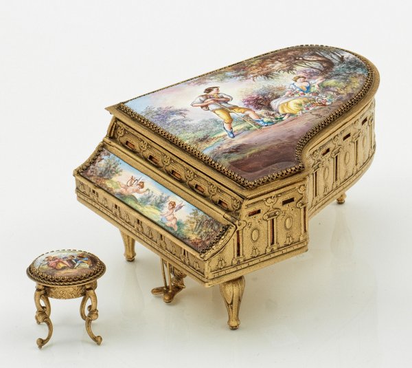 Bronze, vergoldet und teilw. emailliert. Vollplastisch ausgearbeitete Spieldose in Form eines Konzertflügels auf drei konischen Beinen mit kleinem, rundem Hocker. Scharnierter Klavier- und Klaviaturdeckel. Innen ein kleines, mit rotem Samt ausgekleidetes Fach. Wandung umzogen von stilisierten, reliefierten Säulen im Wechsel mit hochovalen Medaillons und Blütenkelchdekor. Die Deckel, die Klaviatur sowie der Hocker verziert mit feiner polychromer Emaillemalerei teilw. mit szenischer Darstellung eines Schäferpaares, Musikanten sowie zwei Putti. Sign. "G (?) B." Auf der Bodenunterseite Aufzug. H. 7,3 cm. 10 cm x 13 cm. Hocker-H. 3,2 cm.