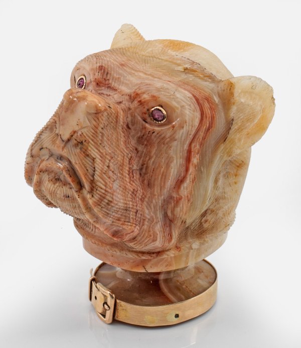 im Stil von Karl Fabergé. Achat und Gold. Über ovaler Standfläche und stark eingezogenem, kurzem Schaft die vollplastische und sehr detailliert ausgeführte Skulptur eines Hundekopfes aus geschnittenem, beige- und rotfarbenem Bandachat mit kleinen gefassten Granatcabochons als Augen. Das Halsband mit großer Schnalle aus Gold. Auf der Standunterseite ein bekröntes, zweigeteiltes Wappenschild mit Darstellung eines Armes mit Säbel über drei Tannen. Gest. 56, Beschauzeichen, unbekanntes Meisterzeichen "O(?)P". H. 8 cm.