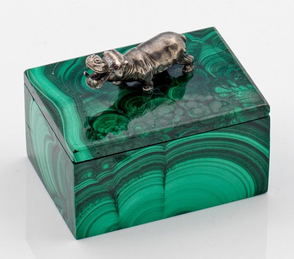 A small Russian malachite box with silver hippo in the style of Karl Fabergé. Marked.