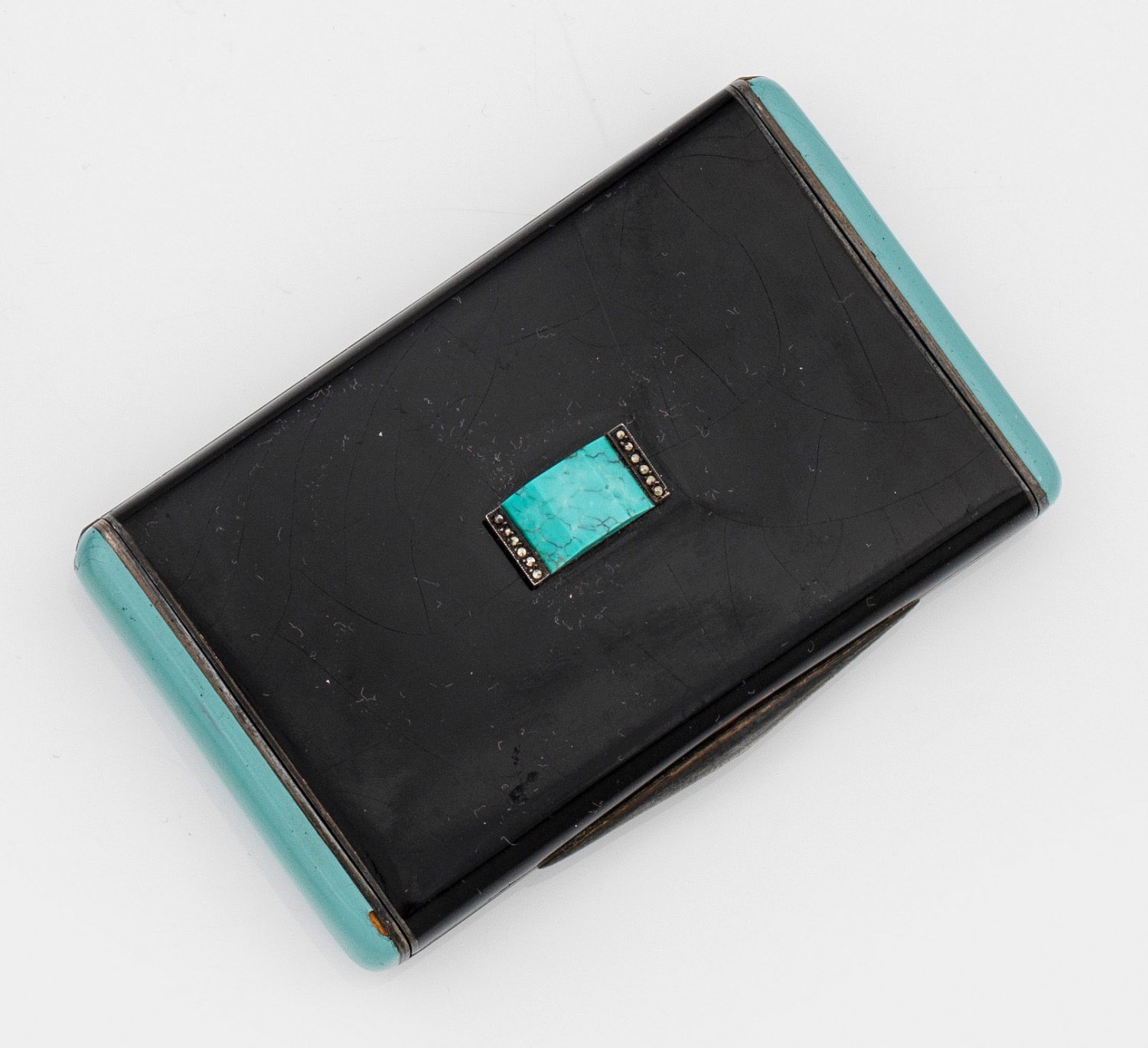 Silber, emailliert. Rechteckig mit gerundeten Ecken und Kanten. Die Kurzseiten opak helltürkis, der Scharnierdeckel und die Unterseite schwarz emailliert. Auf dem Deckel zentral applizierter, gekanteter Türkis, flankiert von Diamantrosen. Innen vergoldet. Gest. 835, Herstellerzeichen. Gew. ca. 75 g. H. 1,2 cm. 7,8 cm x 5 cm.
