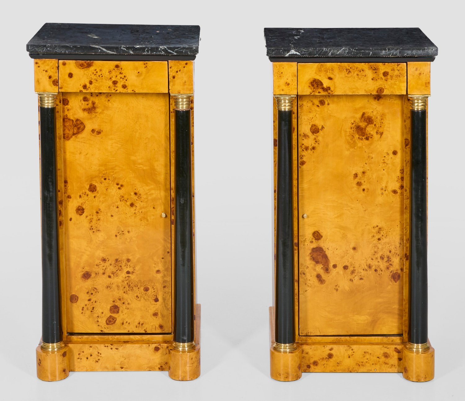 A pair of French maple wood veneered and partly ebonized Biedermeier style cabinets.