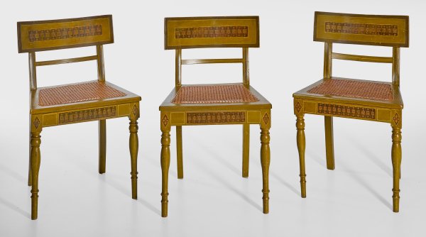 Holz, olivgrün gefasst. Trapezförmige Zarge auf mehrfach gegliederten Balusterbeinen. Niedrige, leicht zurückschwingende Rückenlehnenrahmung mit breitem, gebogtem oberem Abschluss. Dekor aus Rautenmotiven und blütengefüllten Reserven mit dunklem Fond. Sitzfläche aus Rohrgeflecht, minim. besch.; Sitz-H. 46,5 cm.