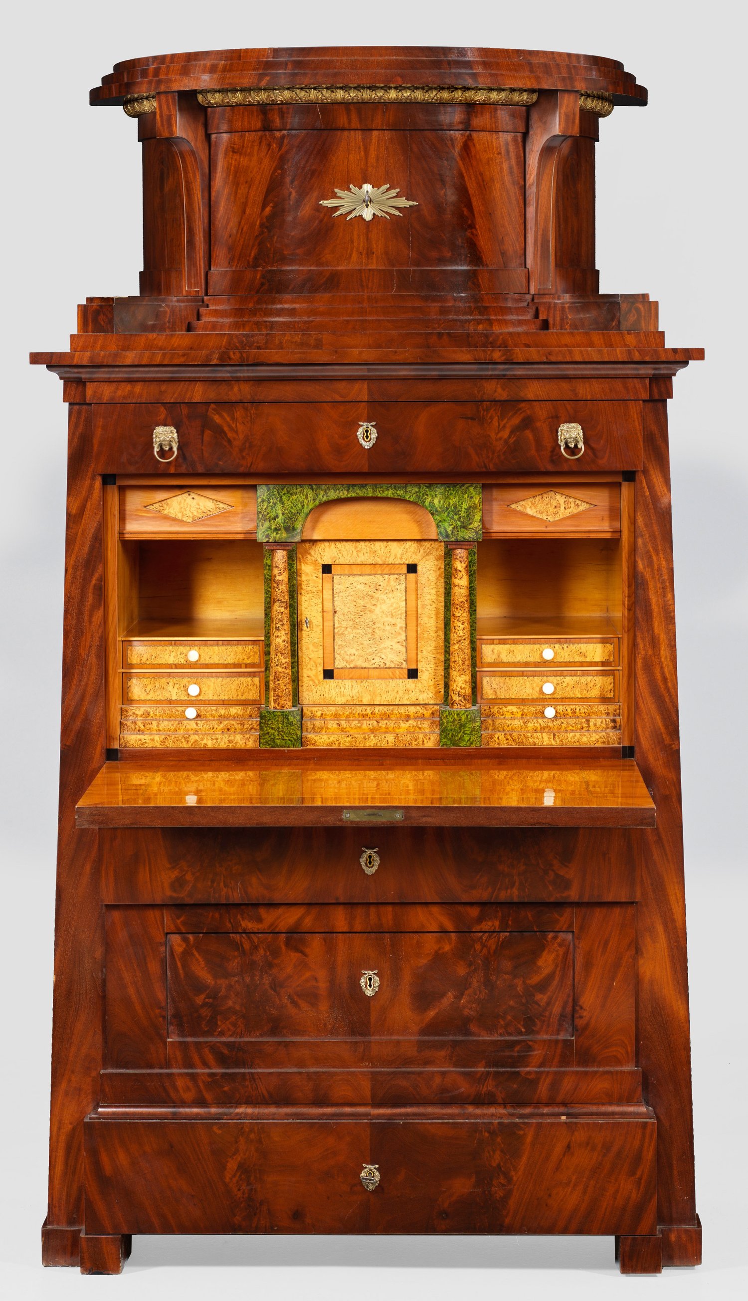 Mahagoni, Kirschbaum und Ahornmaser, furniert und teilw. grün gebeizt. Hochrechteckiger, leicht konisch verlaufender Korpus auf gekanteten Füßen. In der gegliederten Front vier Schubladen unterschiedlicher Größe sowie abklappbare Arbeitsfläche mit zurückgesetztem Segmentbogen. Dahinter gestaffelte, architektonisch gegliederte Facheinteilung. Oberhalb bombierter, eintüriger Aufsatz mit gestuft ansteigendem Gesims und vergoldetem Akanthusblattfries. H. 193 cm. 103 cm x 55 cm. CITES-Bescheinigung liegt vor.