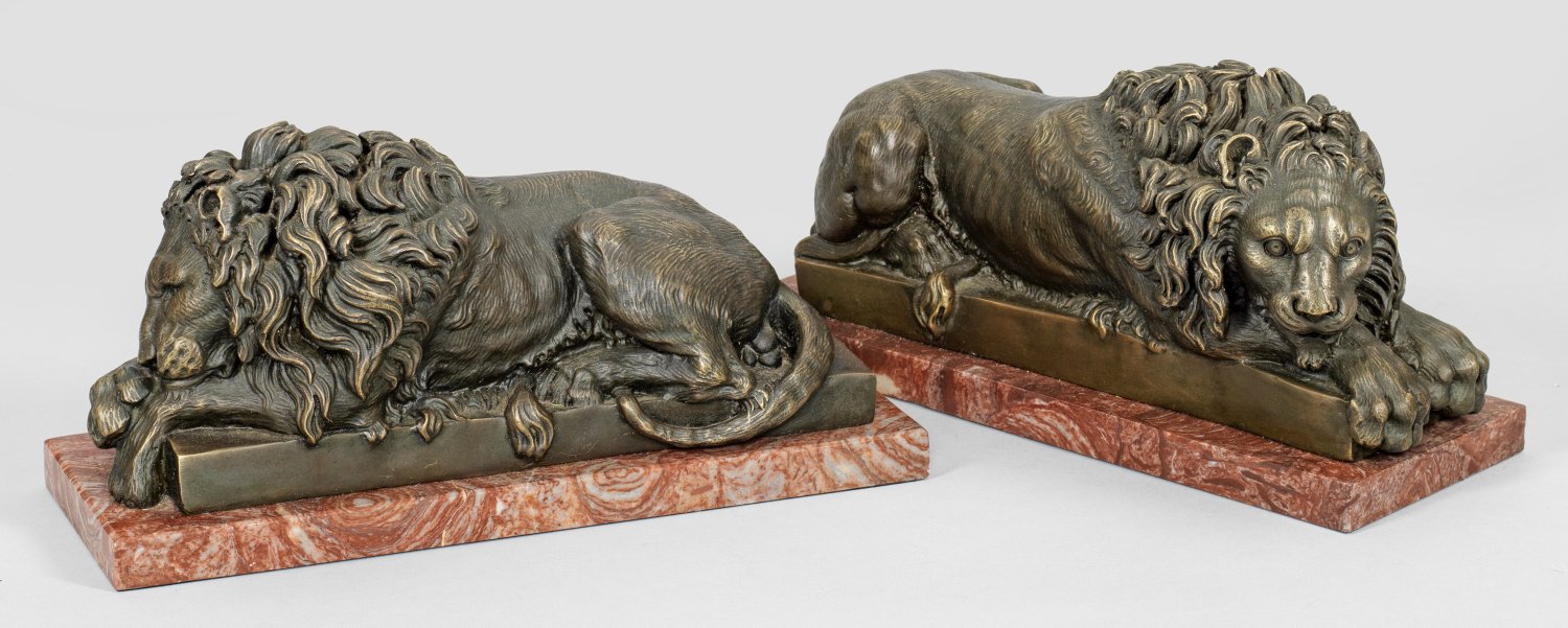 Bronze, dunkel patiniert sowie rot-grau gemaserter Marmor. Über rechteckigem Sockel vollplastische Darstellung eines schlafenden und eines wachenden Löwen in Anlehnung an die berühmten großen Travertin-Originale, die Antonio Canova 1783-1792 für das Grabmal Papst Clemens III. in der Basilika St. Peter in Rom schuf. H. 15 cm. 32 cm x 12 cm.