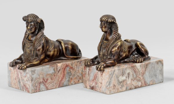 Gegenstücke. Bronze, dunkel patiniert sowie roséfarben und grau gemaserter Marmor. Über rechteckigem, stark marmoriertem Sockel ruhende Sphingen mit blattreliefiertem Brustschild. H. 15 cm. 15,5 cm x 8 cm.