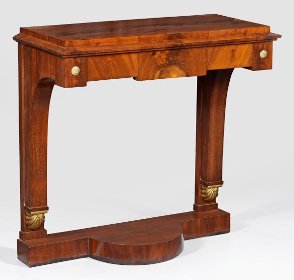 Mahagoni, furniert. Über gekanteter, in der Front segmentförmig ausgestellter Basis, volutenartige Streben mit plastischem Muscheldekor als Träger für gerade Zarge sowie gering überstehende Deckplatte. H. 78,5 cm. 80 cm x 37,5 cm.