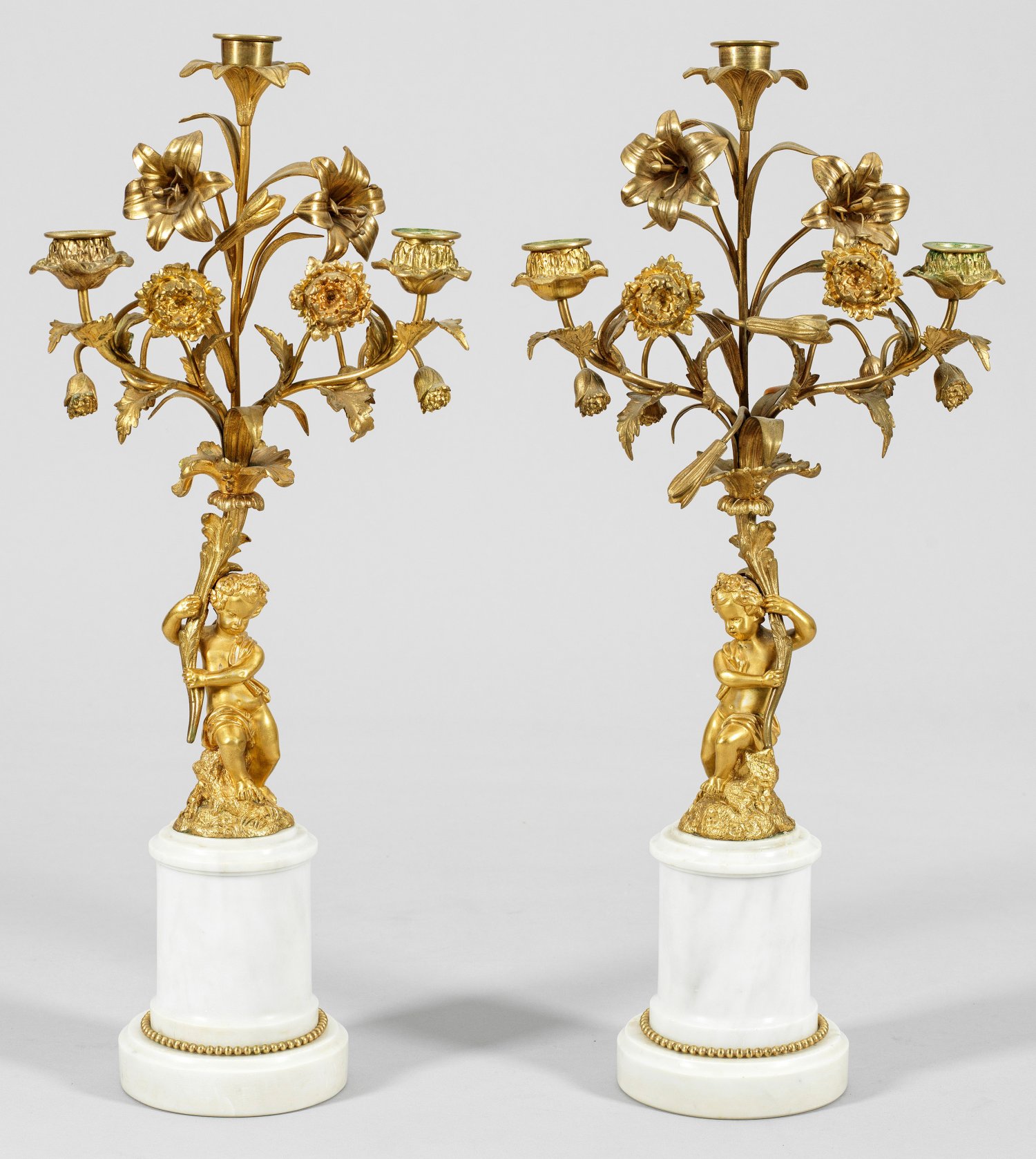 Gegenstücke. 3-flg.; Bronze, vergoldet und weißer Marmor. Über profiliertem Rundsockel mit Perlstabfries zylinderförmiger Säulenschaft. Oberhalb vollplastisch gestaltete Putten mit stilisierten Füllhörnern als Träger für Girandolenelement aus stark geschwungenen Leuchterarmen mit üppigen Blüten. H. 55 cm.