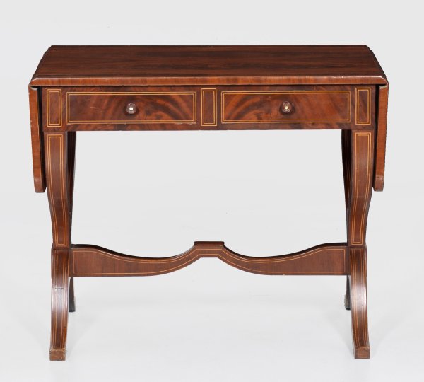 Mahagoni, furniert sowie Einlagen aus Zitronenholz. Gerader, zweischübiger Zargenkasten auf stark geschwungenen Vierkantbeinen, durch korrespondierenden Steg verbunden. Gering überstehende, seitlich aufstellbare Deckplatte. H. 74 cm. 91/145,5 cm x 64,5 cm.