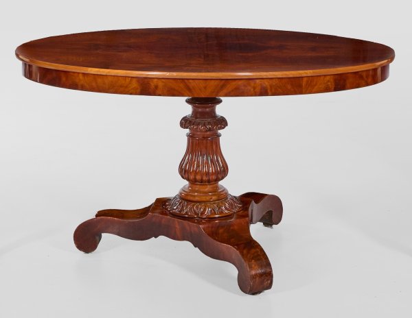 Mahagoni, furniert. Über geschweift ansteigender Sockelplatte aus stilisierten Voluten mehrfach gegliederter, godronierter Balusterschaft als Träger für bombierte Zarge. Gering überstehende, ovale Deckplatte. H. 69 cm. 119 cm x 88 cm.