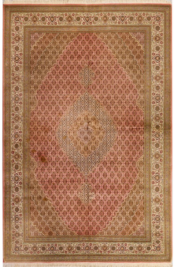 Persien. Korkwolle mit Seide auf Baumwolle. Im roséfarbenen Innenfeld gestrecktes Zentralmedaillon mit Anhängern, breite Ecklösungen sowie flächendeckend dichte sog. Mahi-Musterung. Umlaufend breite, elfenbeinfarbene Hauptbordüre aus Rosetten, flankiert von Bändern. 202 cm x 310 cm.