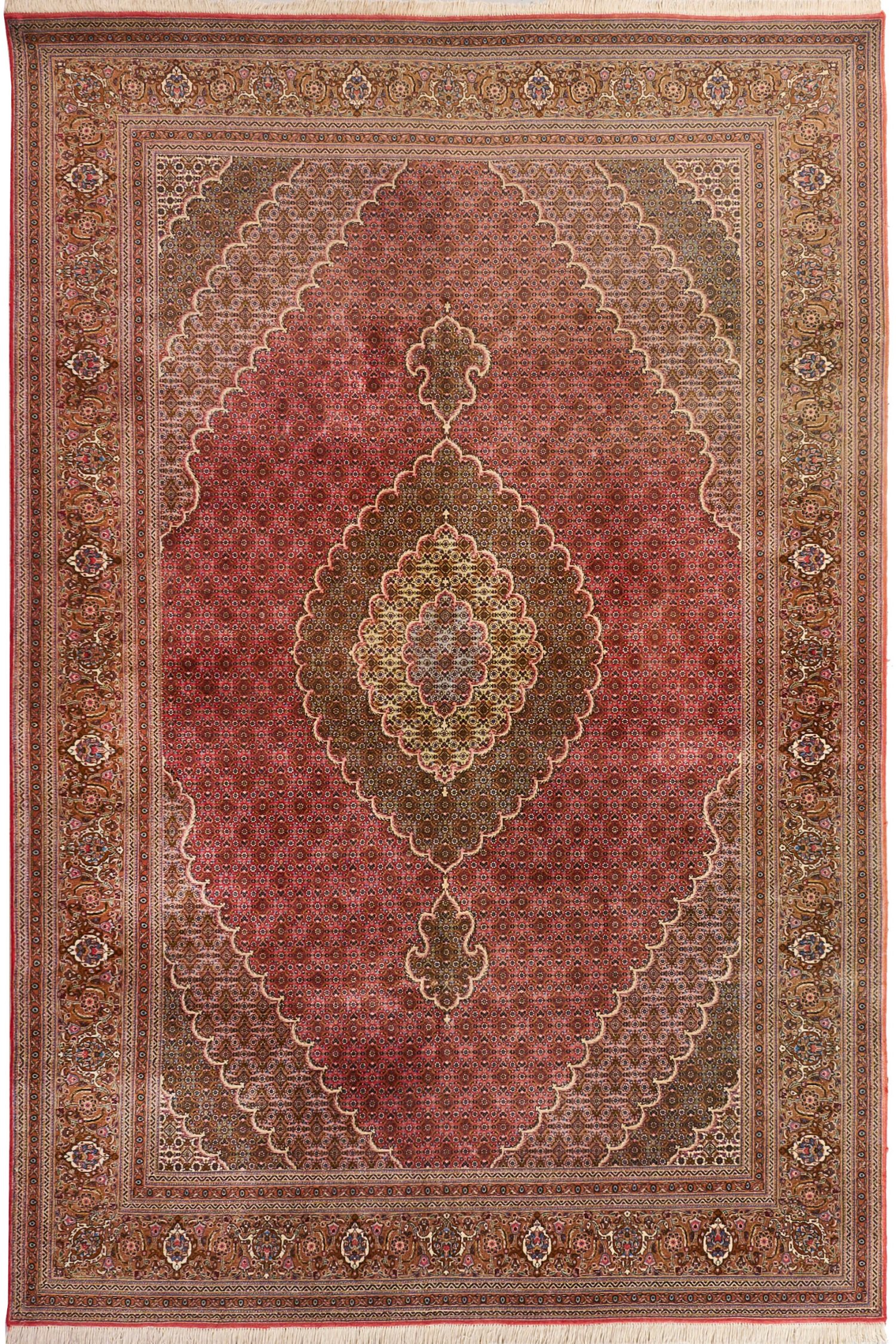 Persien. Korkwolle mit Seide auf Baumwolle. Im roséfarbenen Innenfeld großes Ovalmedaillon mit Anhängern, breite gestuft angeordnete Ecklösungen sowie flächendeckend dichte sog. Mahi-Musterung. Umlaufend breite, beigefarbene Hauptbordüre aus Palmetten, flankiert von Bändern. 189 cm x 298 cm.