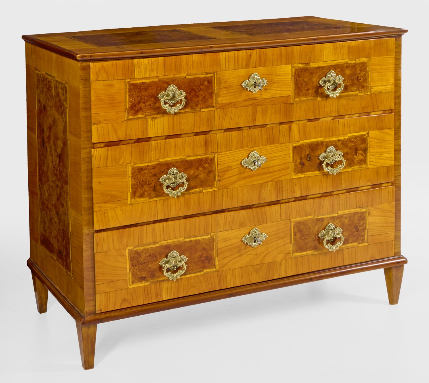 Kirschbaum und Wurzelnuss, furniert. Gerader, querrechteckig angelegter Korpus auf konischen Vierkantfüßen. In der gegliederten Front drei breite Schubladen. Gering überstehende, profilierte Deckplatte. Flächendeckend breit gerahmte Furnierfelder, von Bandeinlagen begrenzt. H. 93 cm. 118 cm x 52,5 cm.